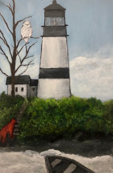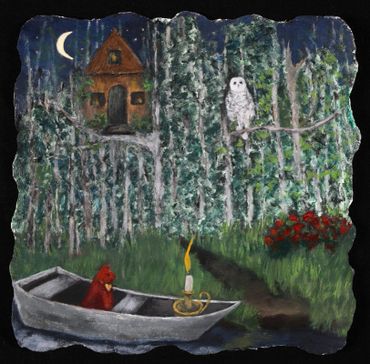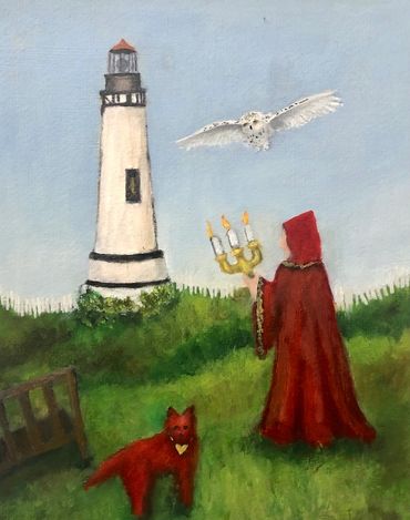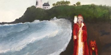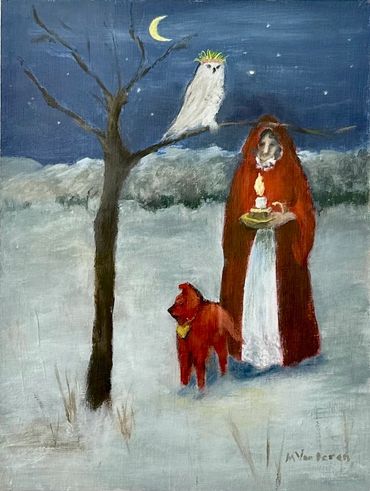 The female figure is central in my work----sometimes reflective or contemplative and alone; sometimes her presence is only implied. The red dog is a nod to my love of those wonderful creatures which have always been a part of my life.